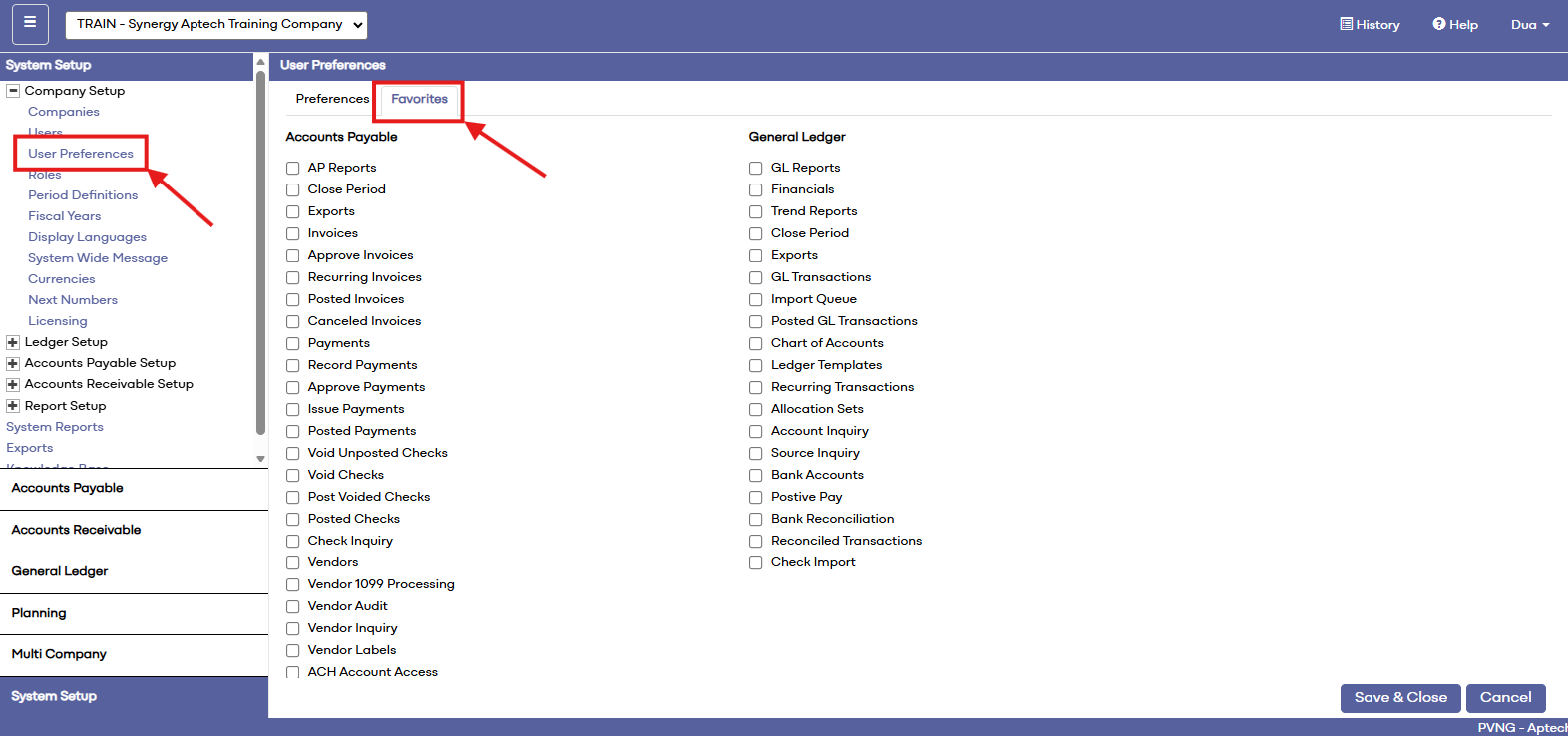Step 7: To create Favorites and easily access frequently used pages, navigate to System Setup, Company Setup, and