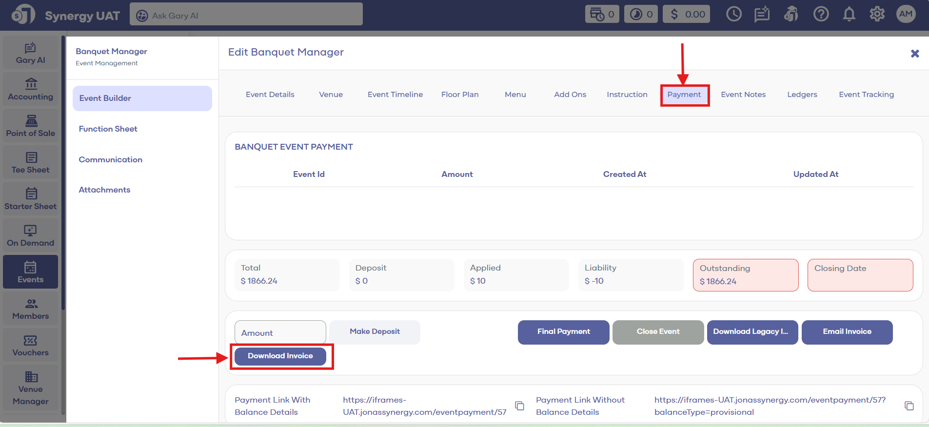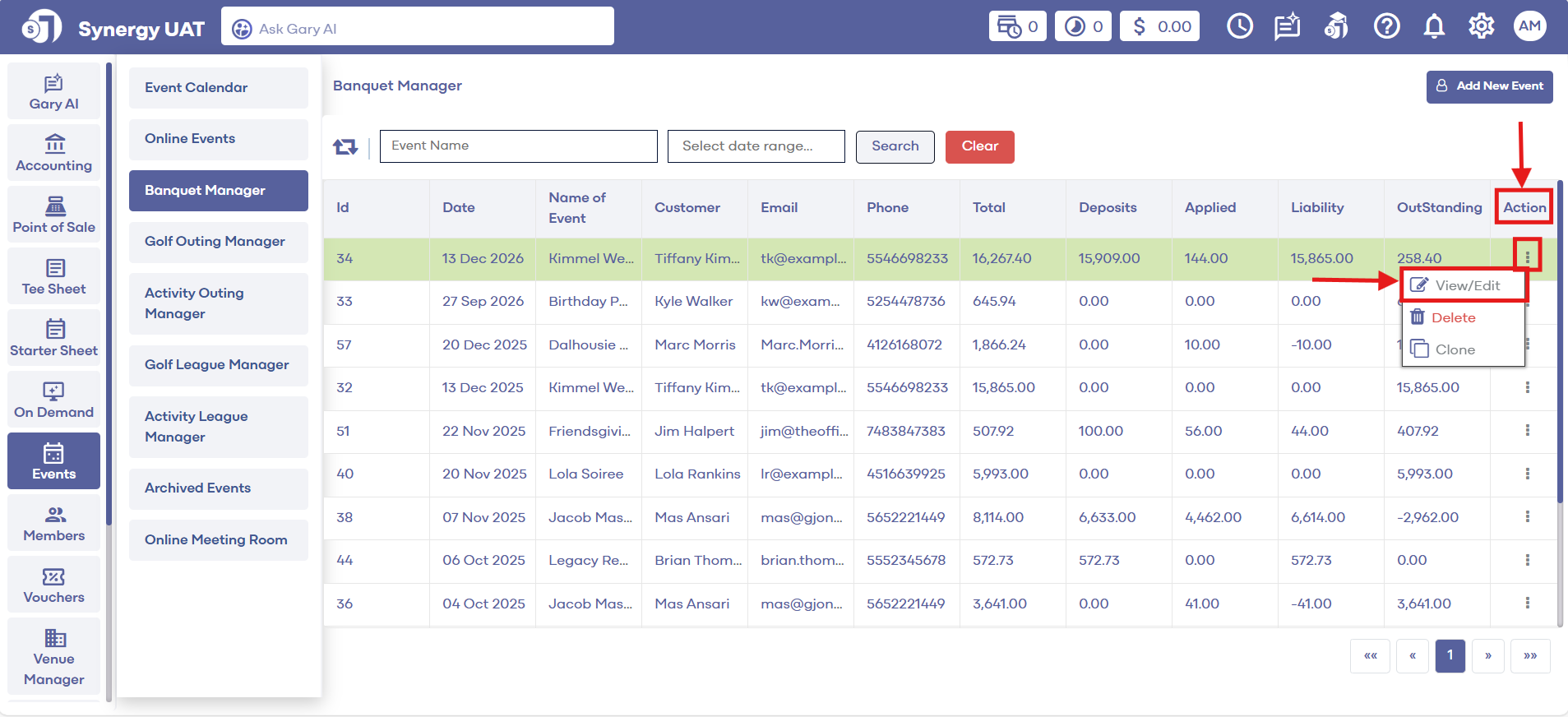 Step 2: Select Banquet Manager from the left-hand menu. The system will show a list of events here. Click View/Edit from the ACTION section of the event to be modified. The system will generate an EDIT EVENT window.
