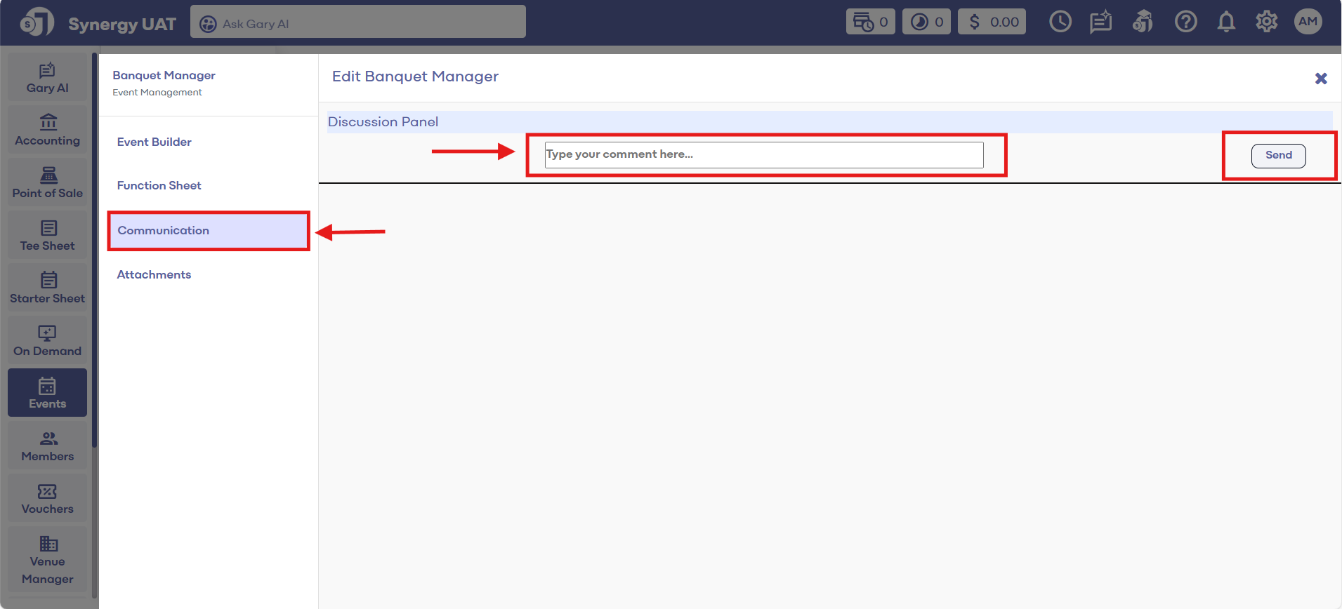 Step 1: Select the EVENTS module from the module navigation menu. Then, click on Banquet Manager in the left-hand menu.