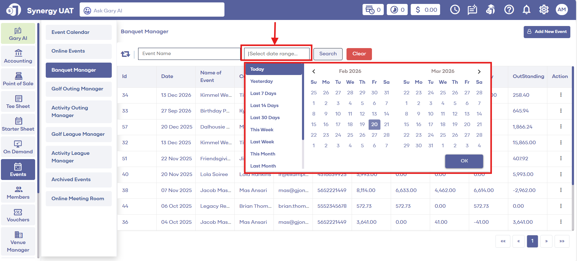 Step 2: The system will show a list of banquet events. Events can be filtered by Day, Date, or Month, then click on the Search button.