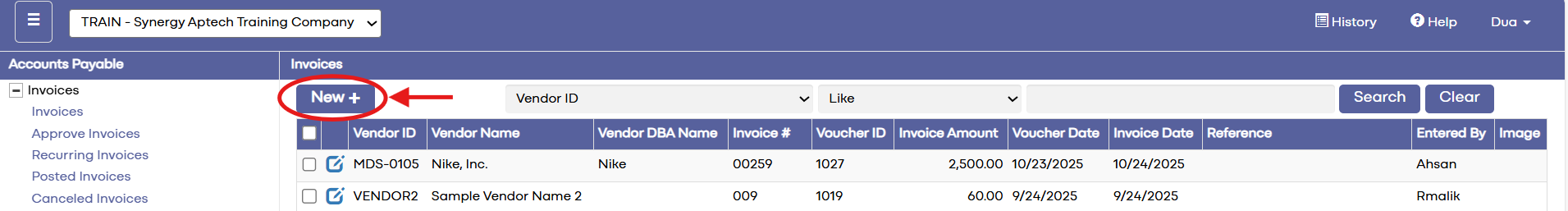 Step 2: To enter an invoice using Intercompany:1. Go to Accounts Payable → Invoices → New.