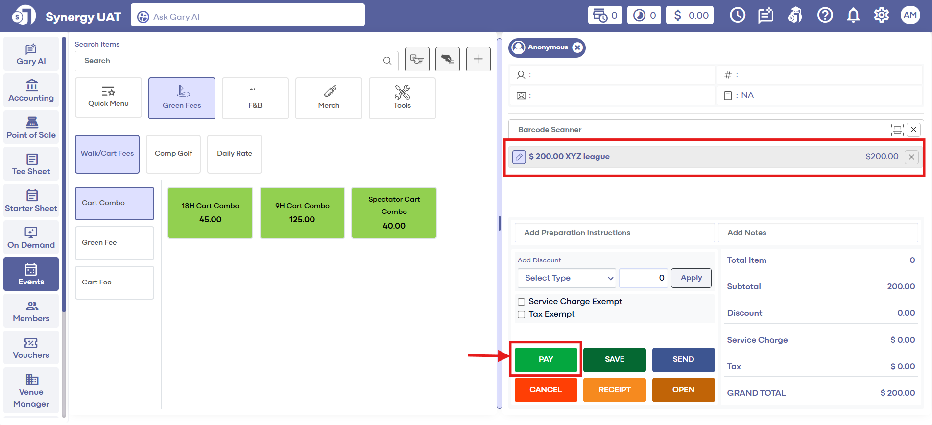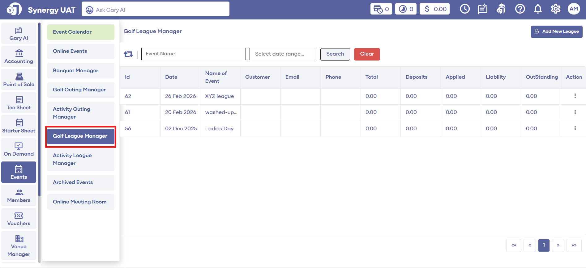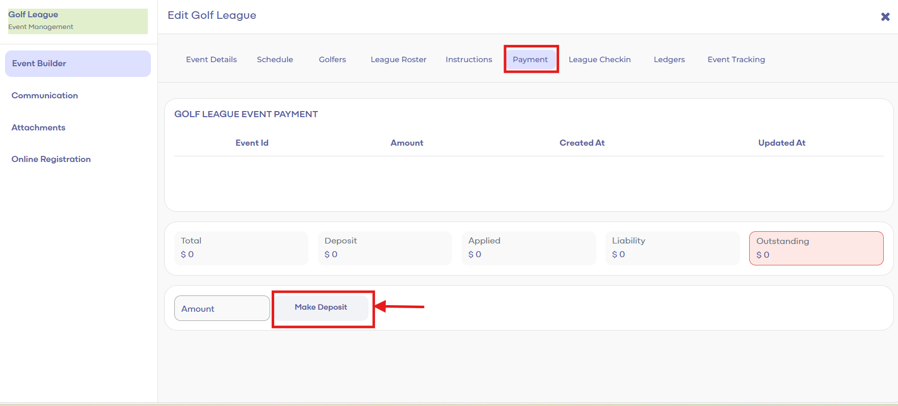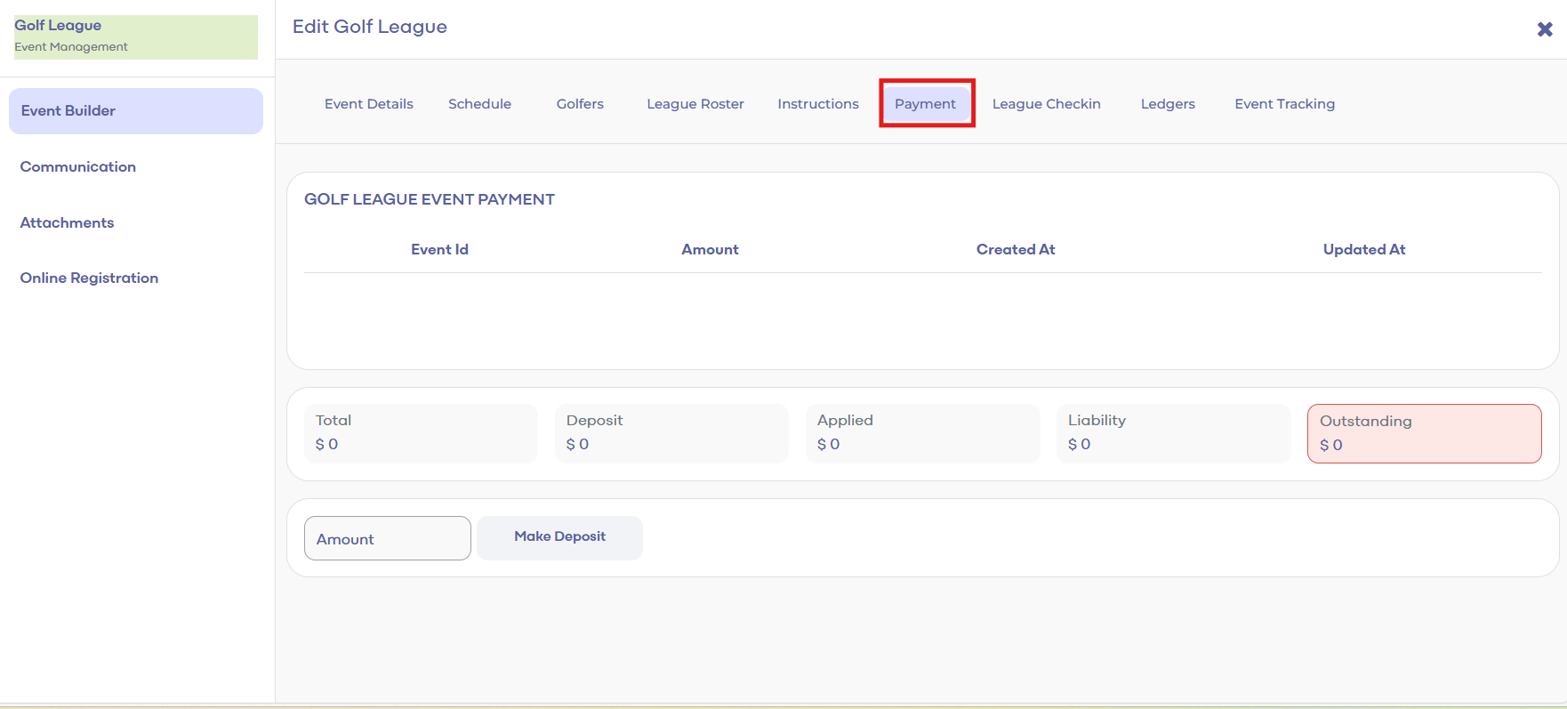 Step 2: Select Golf League Manager from the left-hand menu. The system will show a list of events within the created GOLF LEAGUE MANAGER pane. Double click on the event and the system will generate an EDIT GOLF LEAGUE window. Select the Payment tab under the Event Builder tab.