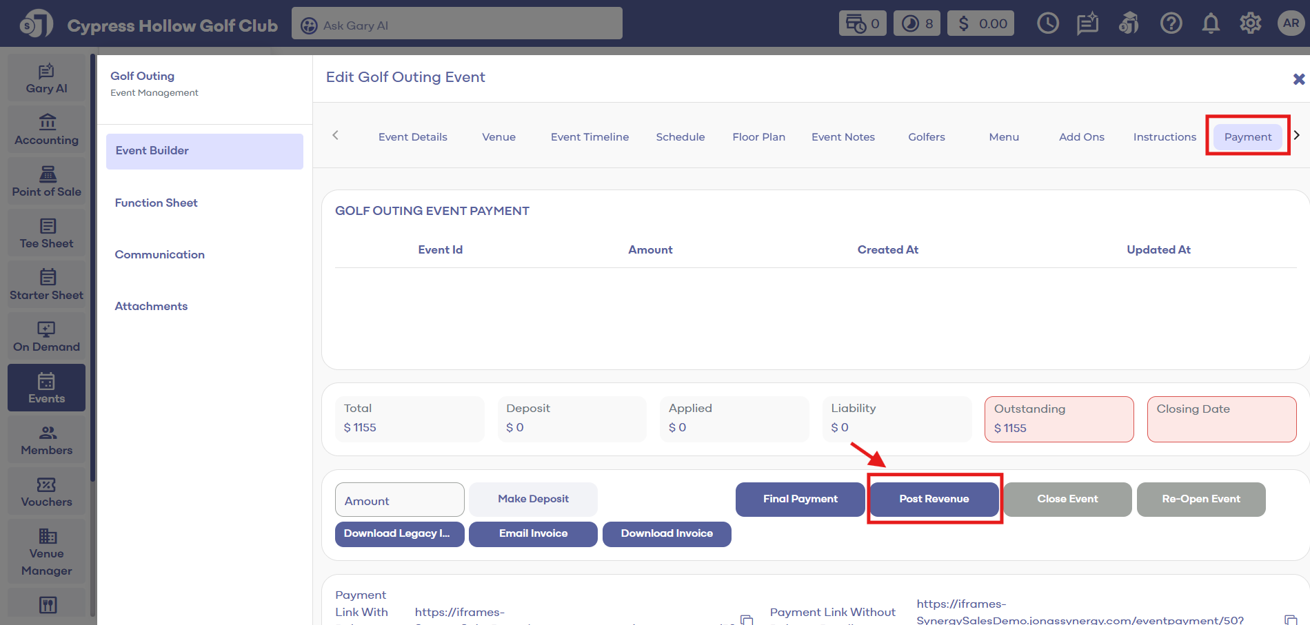 Step 1: Navigate to the EVENTS module. From there, select Golf Outing Manager from the left menu pane.