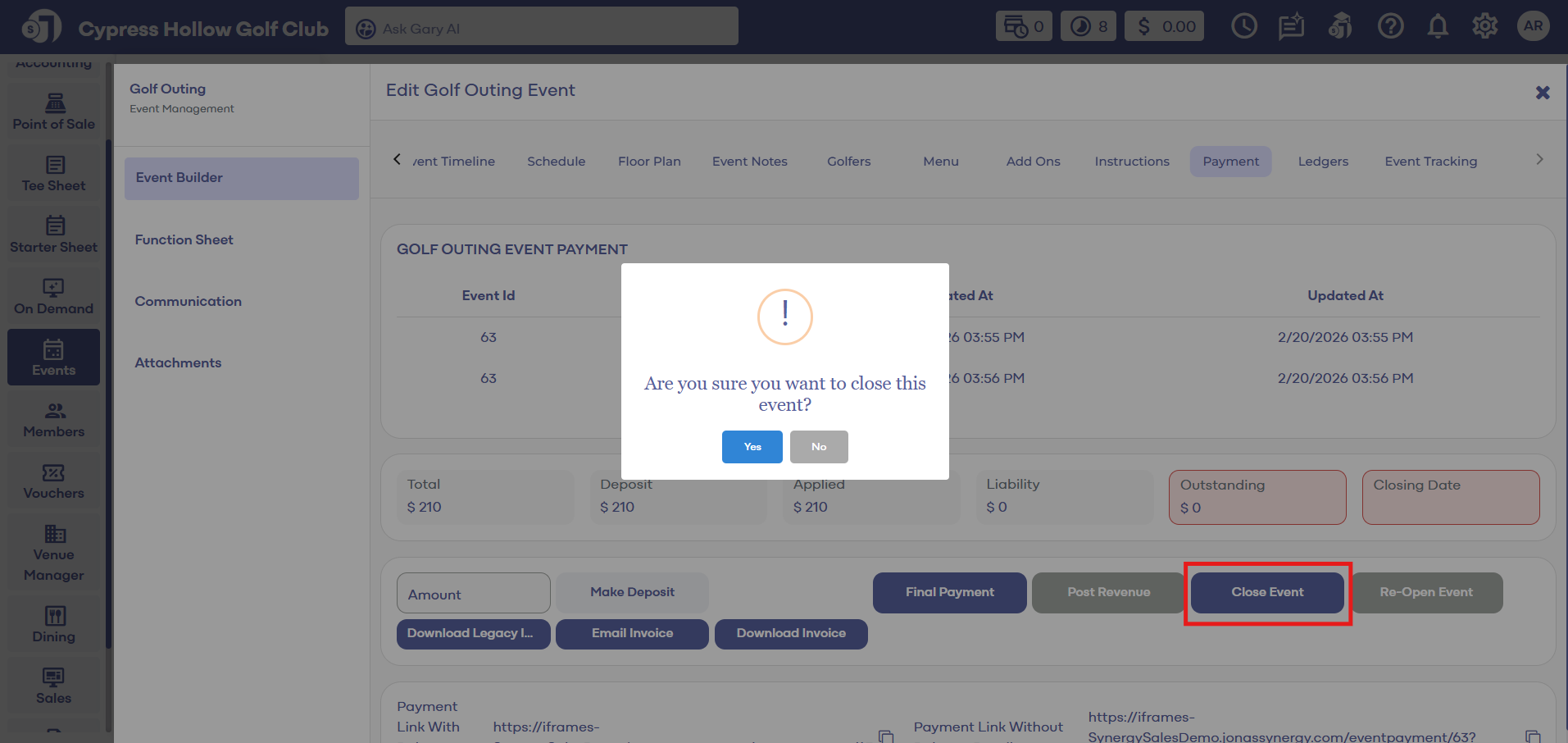 Step 2: In the GOLF OUTING MANAGER, choose the event you want to close from the list. To open the EDIT GOLF OUTING EVENT window, either double-click on the event or click the event's ACTION button and then select View/Edit.