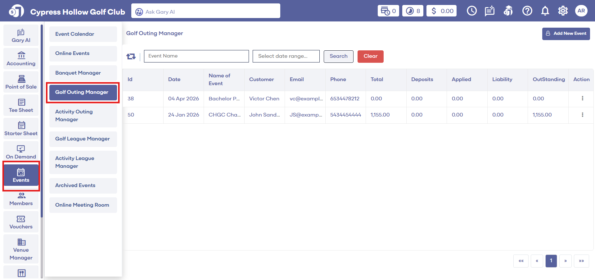 Step 1: Select the EVENTS module from the module navigation menu. Then, click on Golf Outing Manager in the left-hand menu.