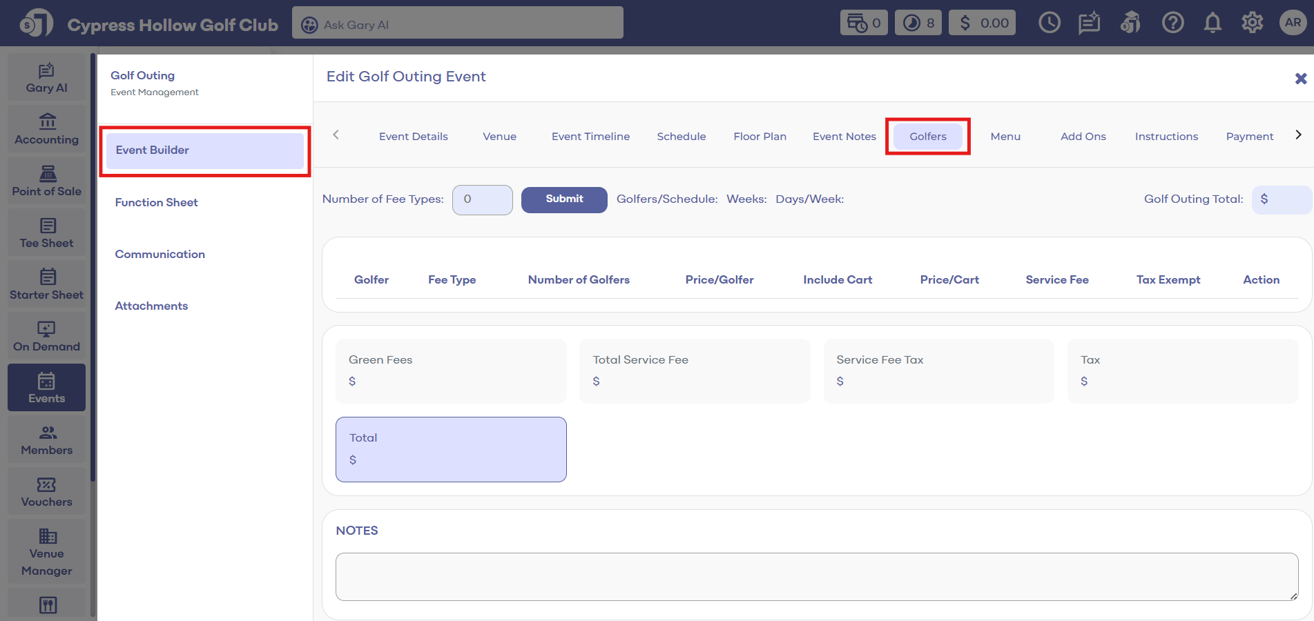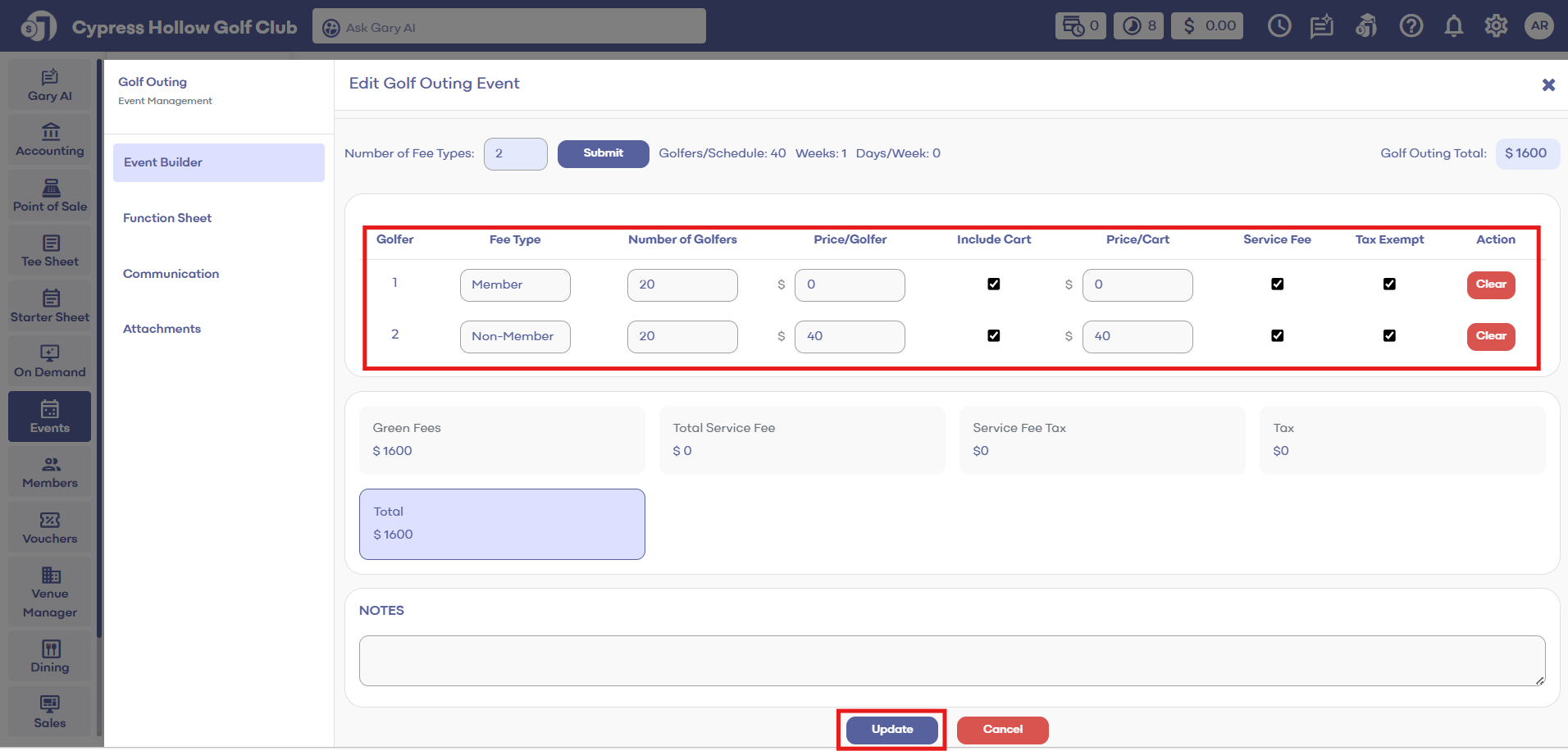 Step 3: Golfer info can be edited by entering the number of fee types and adding pricing and cart information to the respective fee types. Once completed, click the Update button.