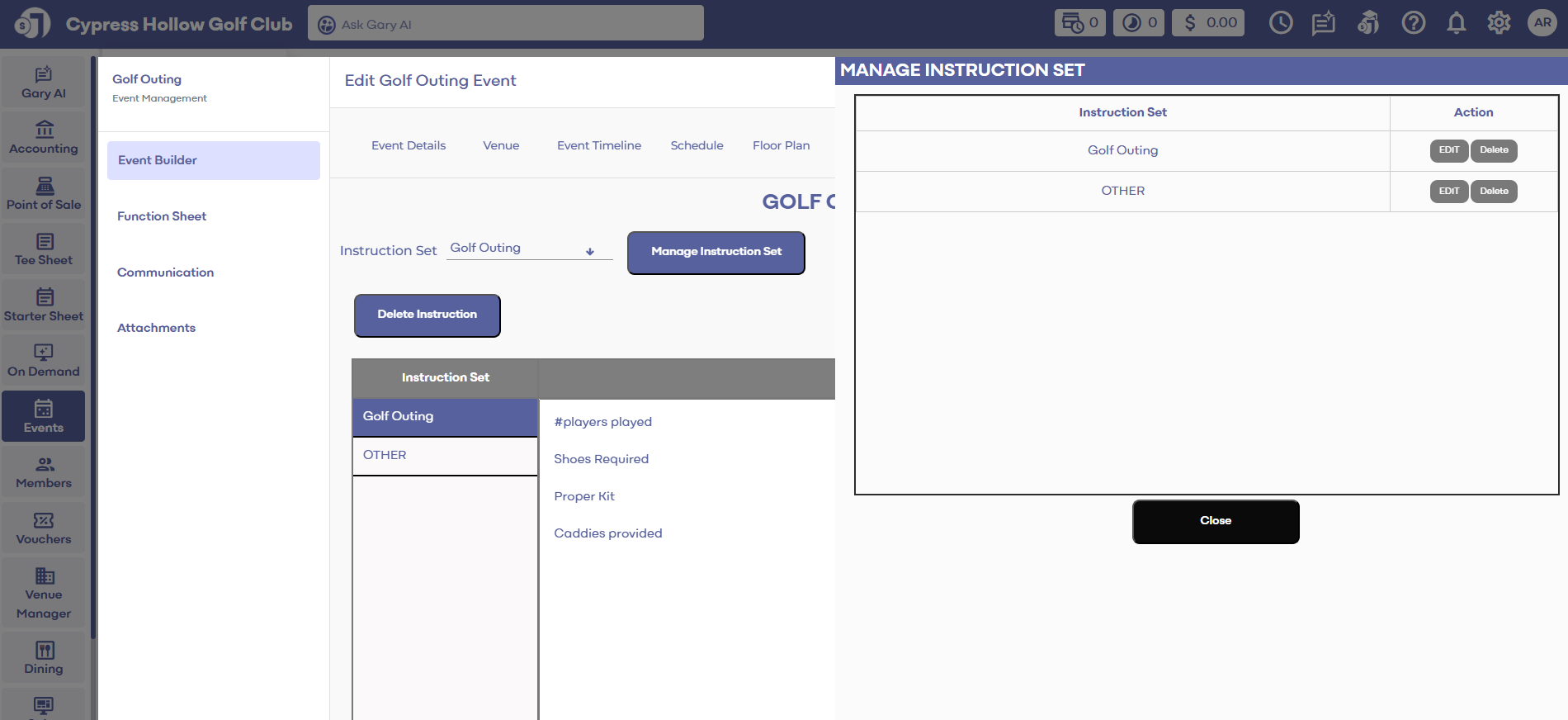 Article Contents: This article contains step-by-step instructions on how to manage departments and how to add instructions to departments. Step-By-Step: Step 1: Select the EVENTS module from the module navigation menu. Then select Golf League Manager ...