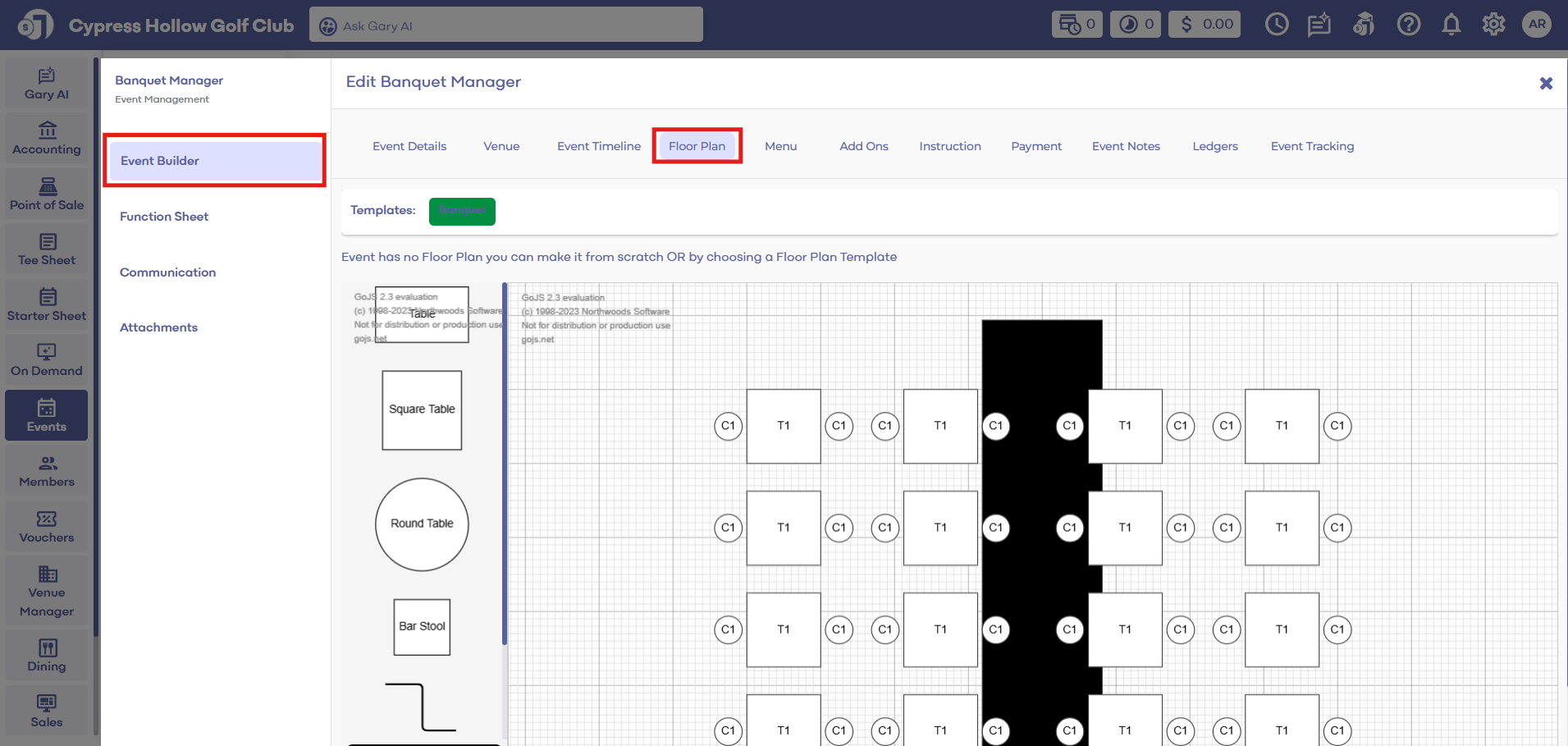 Step 1: Click on Events module along the left column. Then, select the event, and within an event builder, click on the Floor Plan tab.
