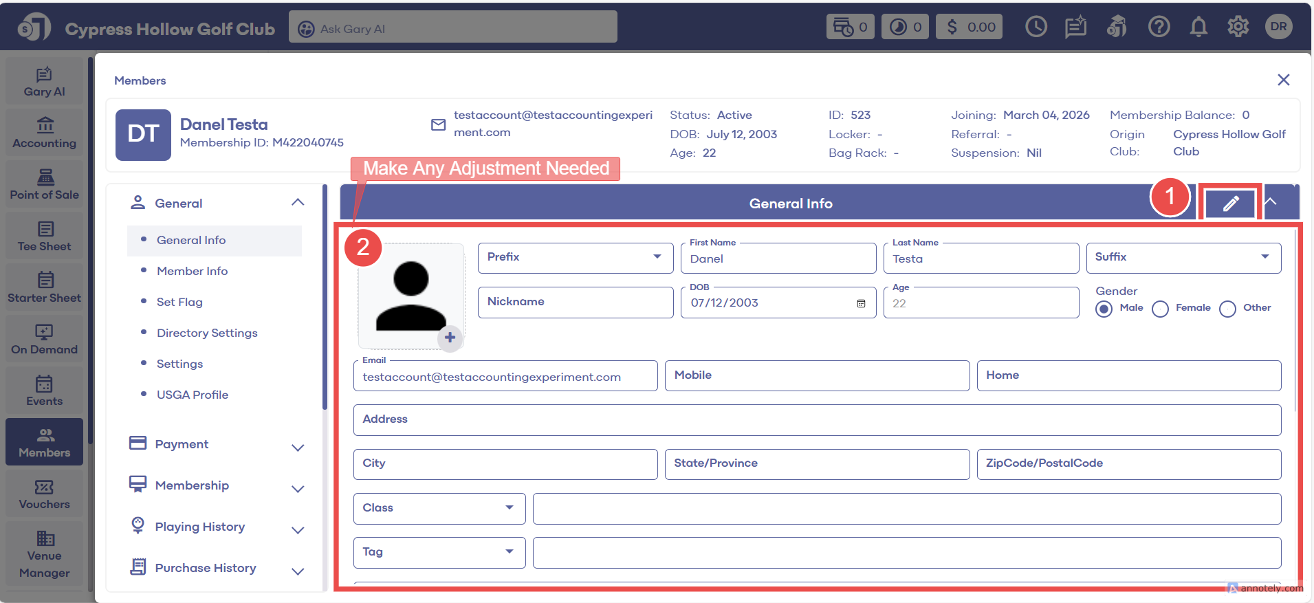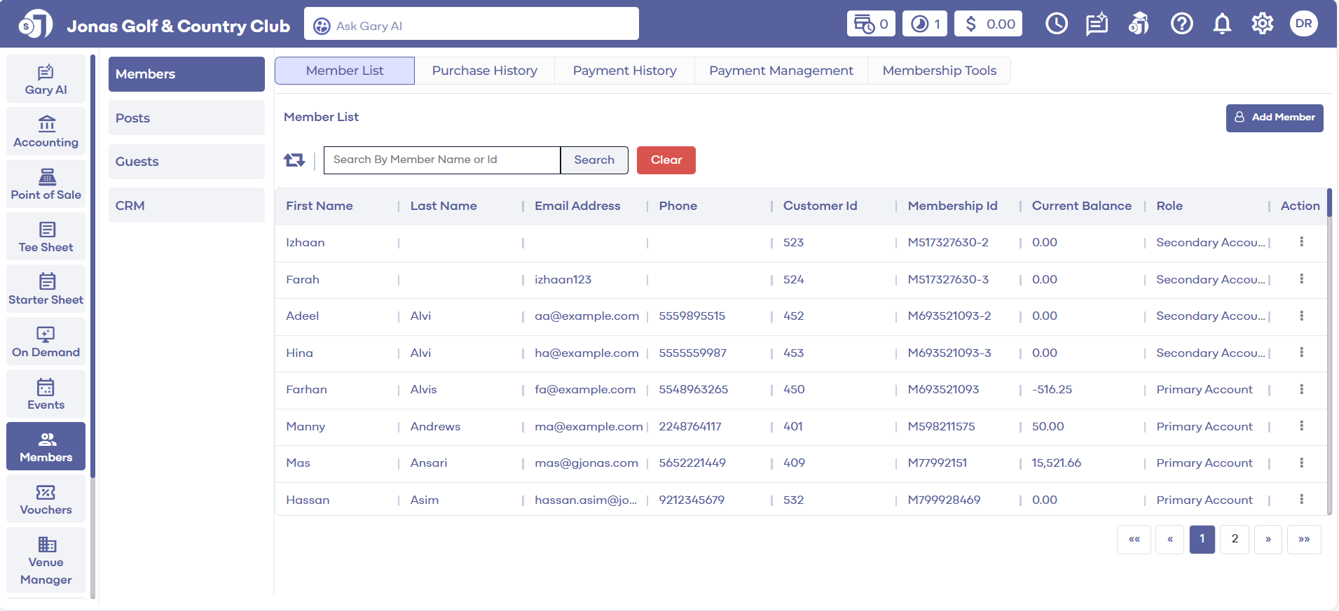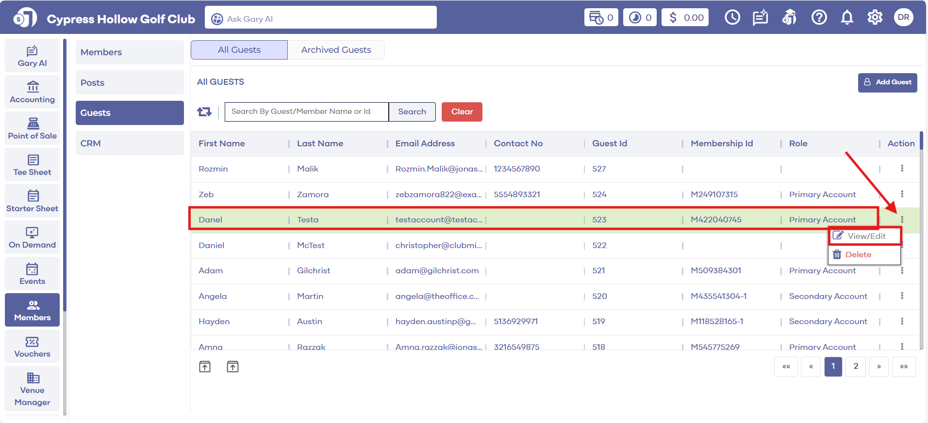 Step 2: Click on the Members button on the left side of the window to go to the member list. The Member List window shows all the members created for the Golf Course. Use the Guests header tab to add new members. Please refer to the article on the Guests header tab for more details.