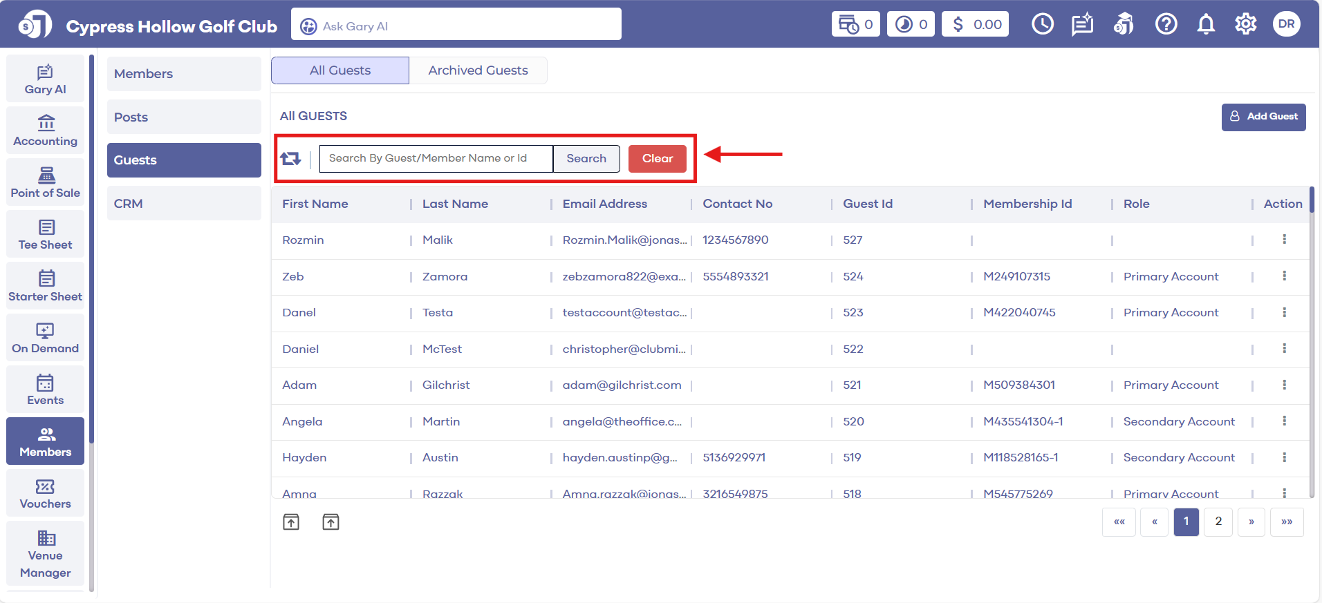 Search: Search the member by their Membership ID number or enter a Guest name and click on Search. The system will generate the list of members.