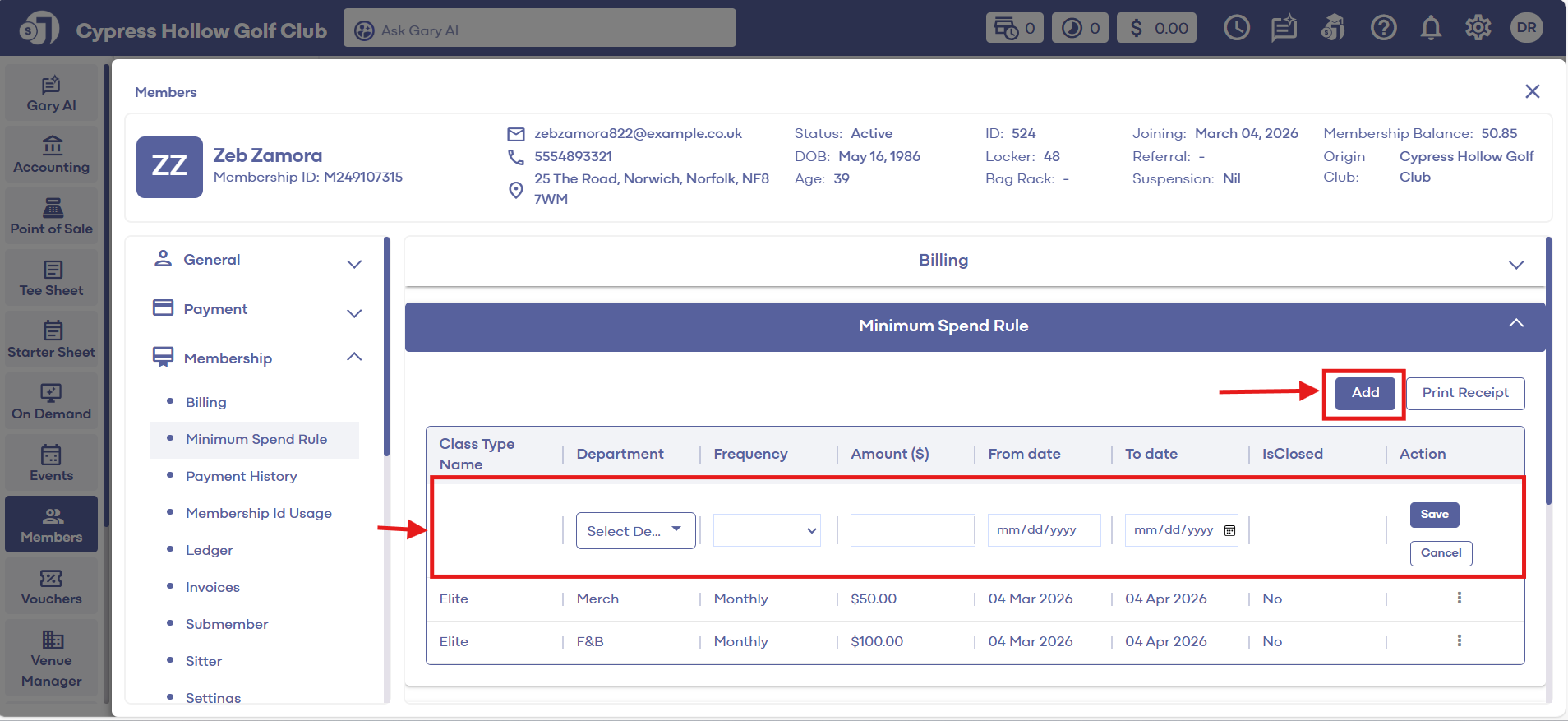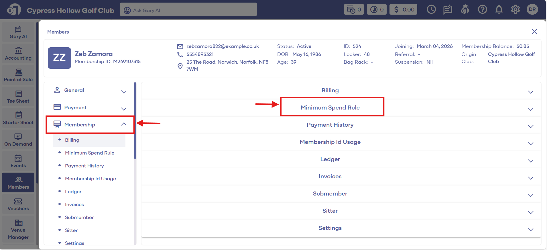 Select "Minimum Spends Rule" under the Membership tab. Click on the Add button and setup minimum.