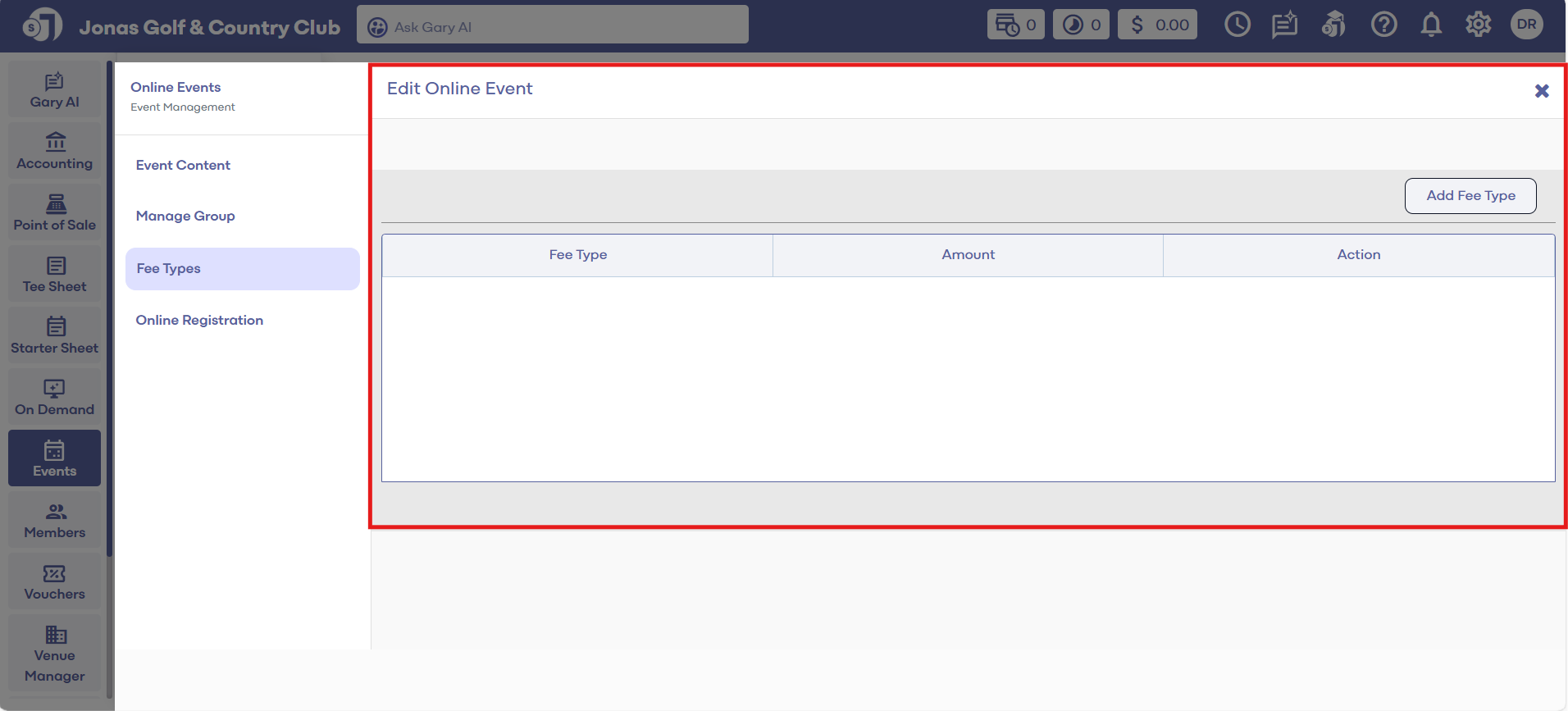 Step 4: Once the event is created, the other tabs of Manage Groups and FeeTypes will be available.