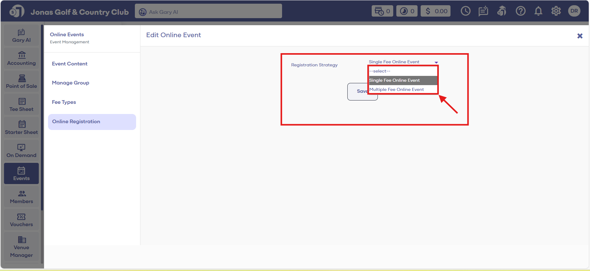 Online Registration tab, click the dropdown, and select