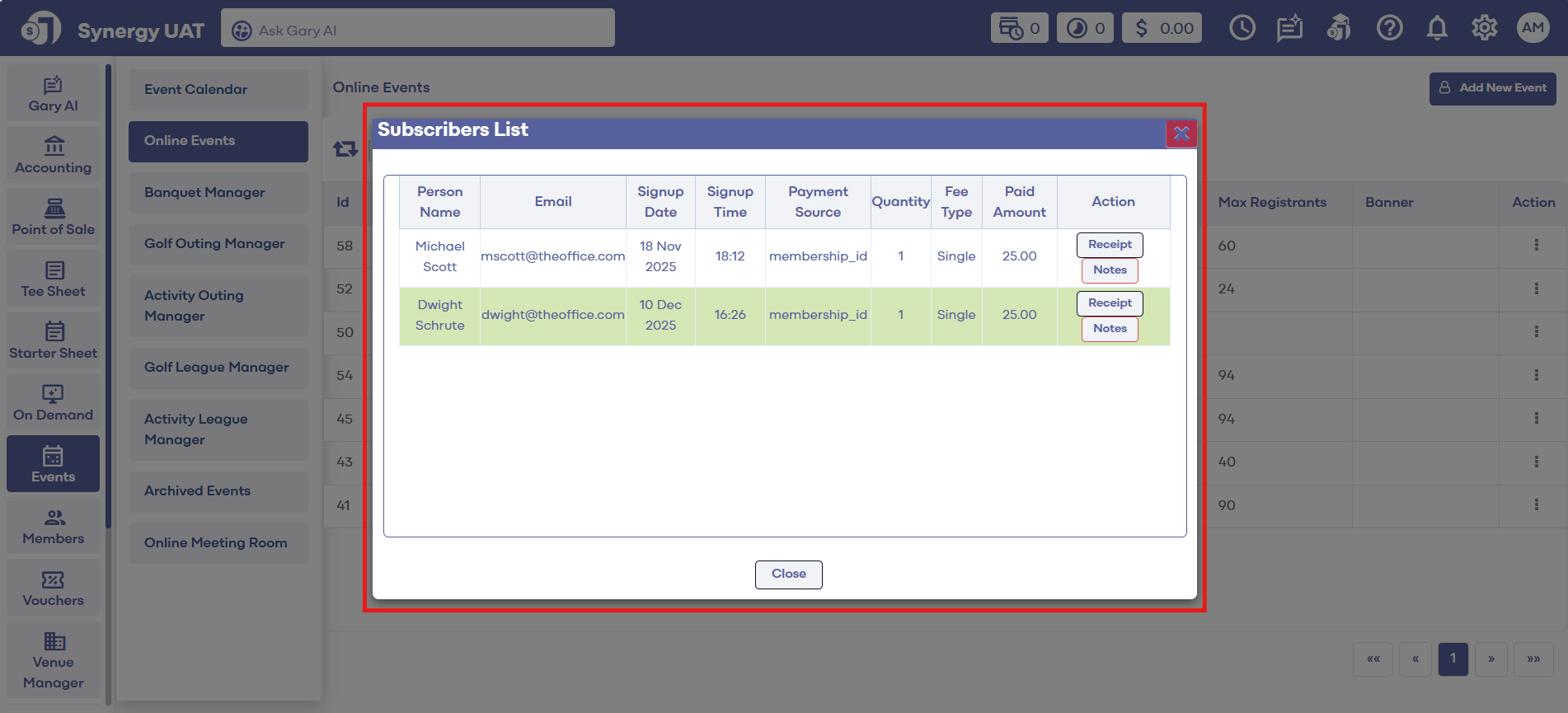 Step 2: From here, navigate to the right side of the screen where you will click on Action (three dots) on the line of the event you'd like to choose. Then click on Registrations. The window will show details of guests who have booked the event. Details that are given: Name, Email, Signup Date, Payment Source, Quantity, Paid Amount, and Notes.