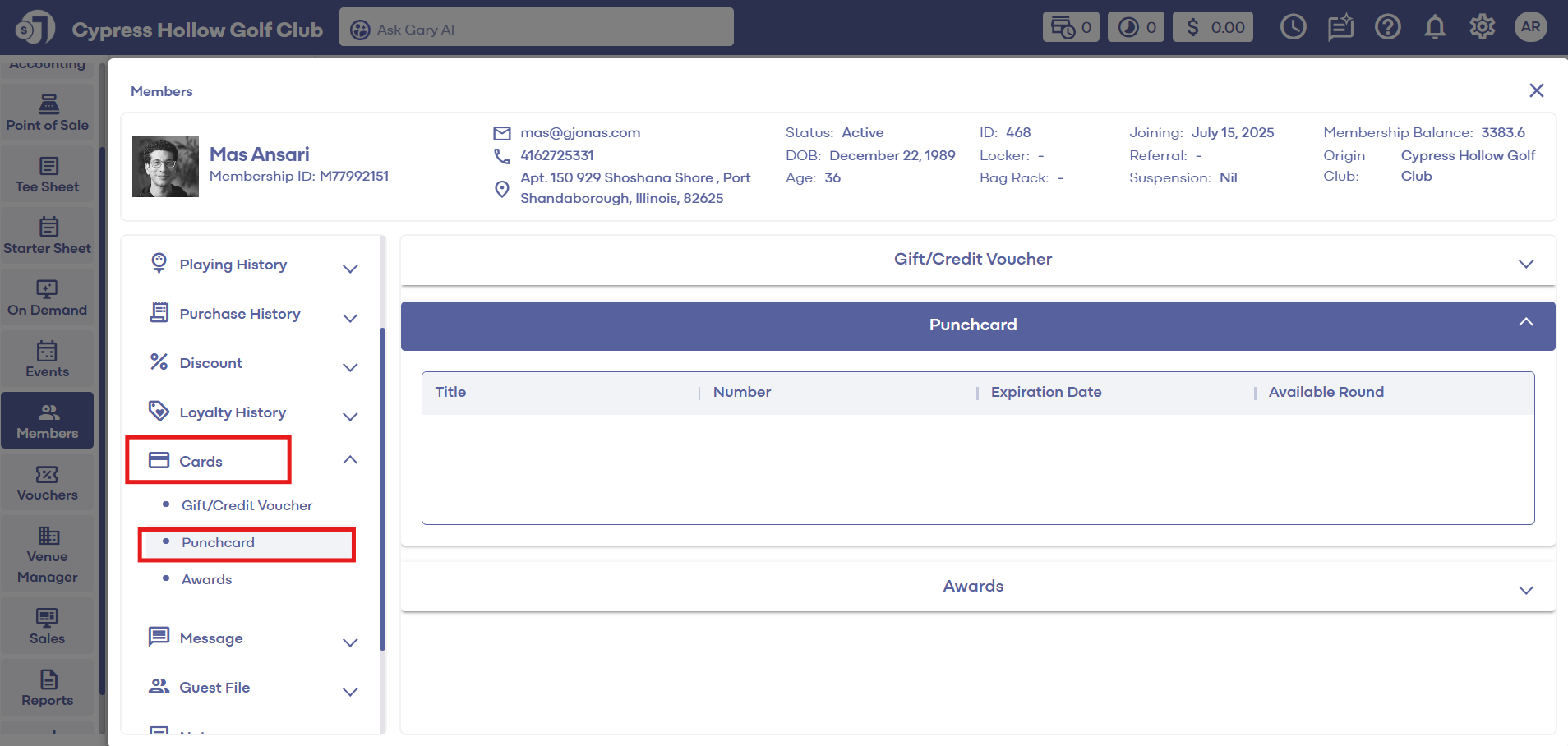 Step 3: Click 'PUNCH CARDS' which can be found under the 'Cards' tab. The 'Punchcards' window displays members’ punch cards: 'Title', 'Number', 'Expiration Date', and 'Available Rounds'.
