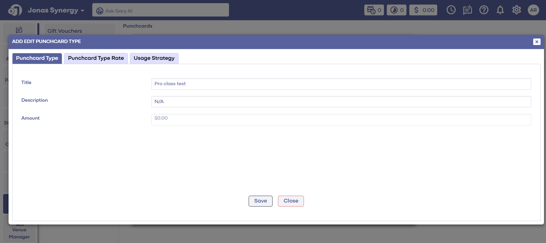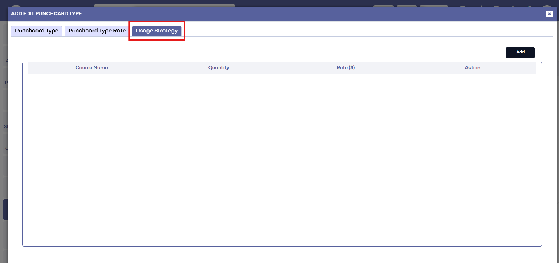 Step 3: Clicking the tab 'PUNCH CARD RATE' will allow for the viewing of a punchcard's 'Quantity', 'Rounds Used', and 'Rounds Reserved'. Clicking the 'Usage Strategy' button will display a more detailed listing of usage in a system-generated 'ADD/EDIT Punch card type' pop-up window.
