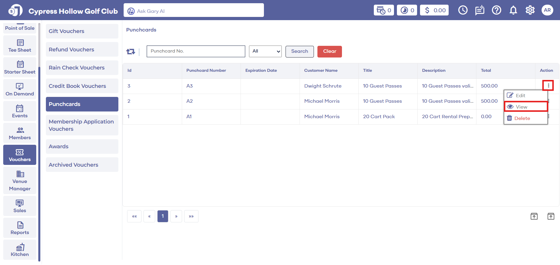 Step 2: Search for a punch card number using the provided search field or navigate to the guest to be viewed. Click the 'View' button for the guest. The system will open a 'PUNCH CARD VIEW' pop-up window.
