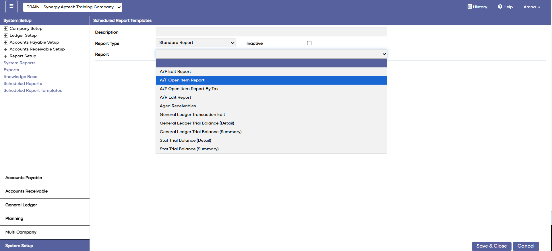 Allows selecting from predefined reports such as A/P Open Item Report By Tax, A/R Edit Report, Aged receivables and others. Simply choose the report and save the template.