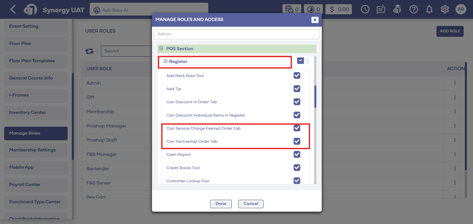 Step 3: In the Manage Role pop-up window, navigate and click on the Point of sale section, and then toggle on Can Service Charge Exempt Order Tab and/or Can Tax Exempt Order Tab.