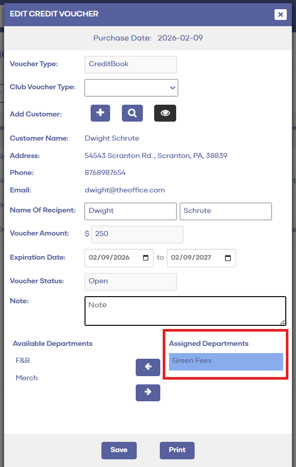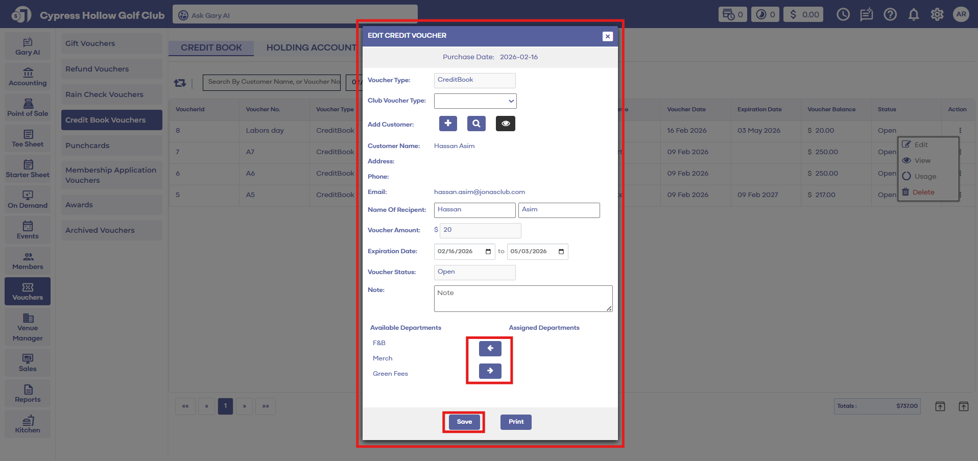 Step 2: Click on Edit for the Voucher that you want to adjust. Then in the Edit Credit Voucher pop up, select which departments you want the voucher restricted to at the bottom by clicking on the arrows. Once you have the departments under Assigned Departments that you want the Voucher valid for, click Save.