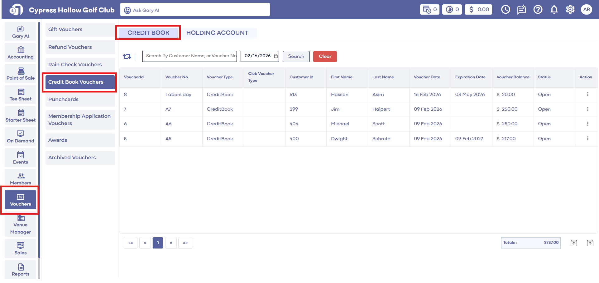 Step 1: Click on the Vouchers module along the top row. Then, click on Credit Book Vouchers on the left hand menu followed by the CreditBook tab.